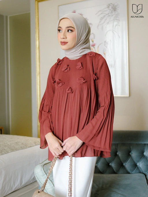 Aksen pleats di bagian dada membuat blouse ini semakin menarik.